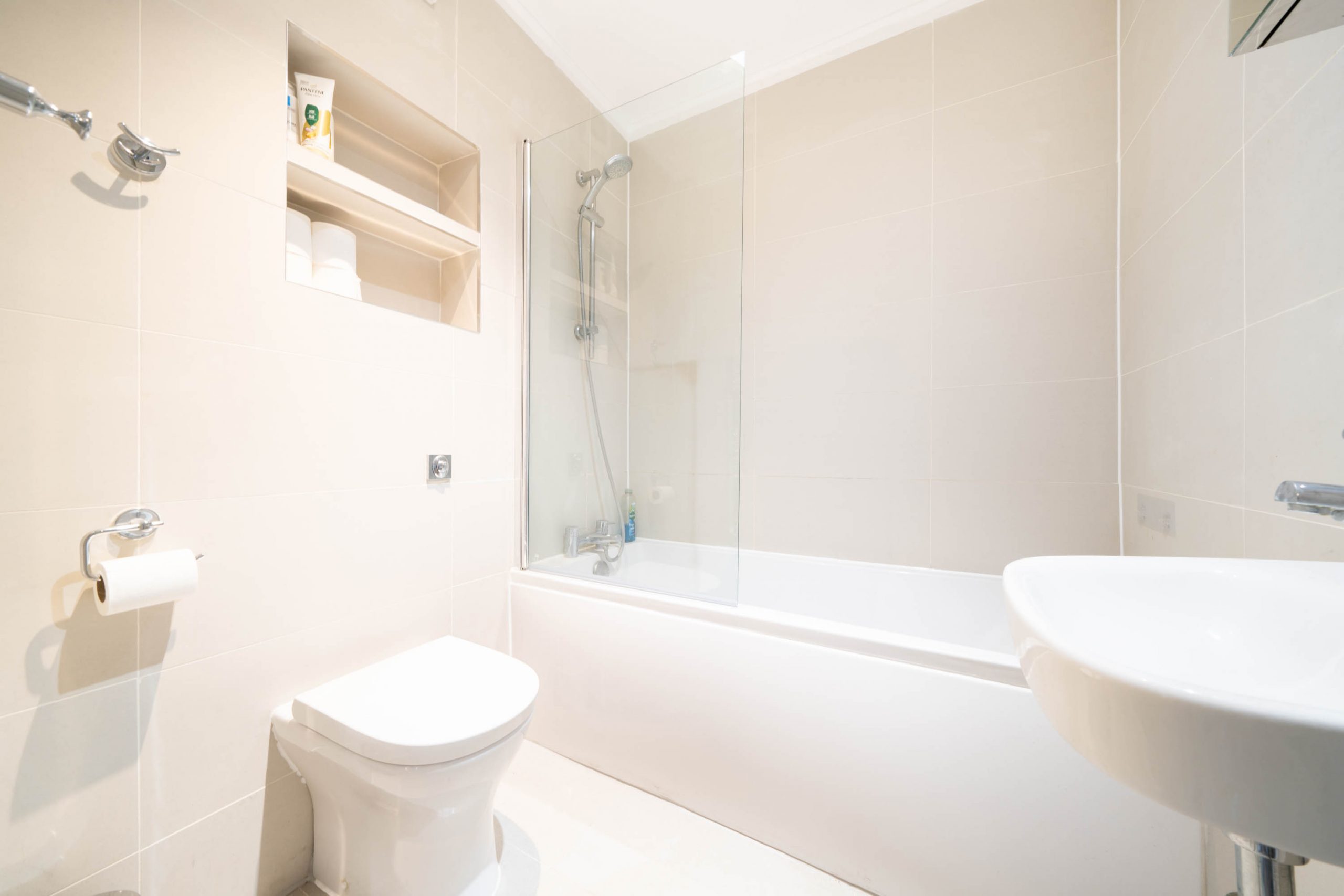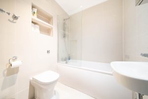 – Fully tiled bathroom with bath & shower over